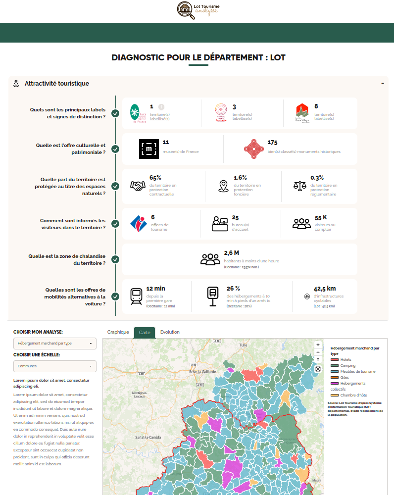 L'Agence de Développement Touristique du Lot souhaitait rendre les données touristiques de son territoire accessibles à un large public : personnel technique des offices de tourisme, élus locaux, professionnels du secteur, porteurs de projets, journalistes et grand public.